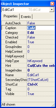 Пользовательский интерфейс современных приложений весьма многообразен, и зачастую один и тот же результат можно получить разными способами — щелчком на кнопке на панели инструментов, выбором пункта меню, нажатием комбинации клавиш и т. п. Можно решить проблему "в лоб" и повторить один и тот же код два, три раза и т. д. Недостатки такого подхода, очевидно, не обязательно комментировать. Можно воспользоваться Инспектором объектов и назначить пункту меню тот же обработчик события, что и кнопке, благо событие